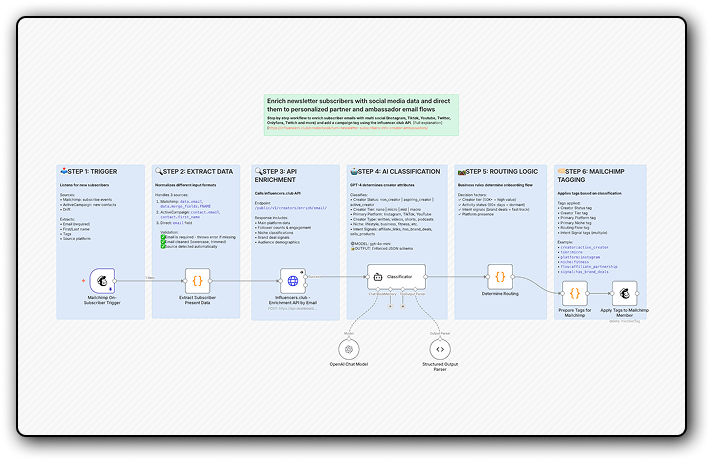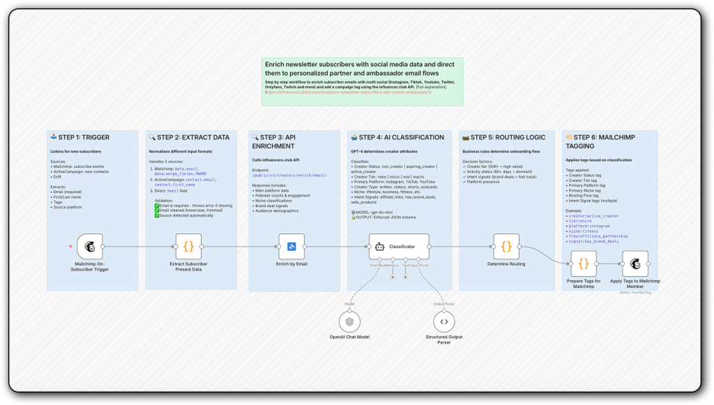 Enrich subscriber emails to identify creators and automatically route them into creator outreach or ambassador programs.